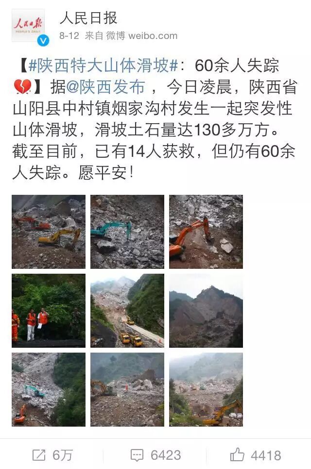 陕西省山阳县中村镇烟家沟村发生一起突发性山体滑坡,滑坡土石量达130多万方,经过救援已有14人获救,但仍有60余人失踪。