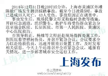 昨日(2014年12月31日)晚间23时35分许,上海外滩陈毅广场发生人群拥挤踩踏事故。截至今晨5时已造成35人死亡,43人受伤。