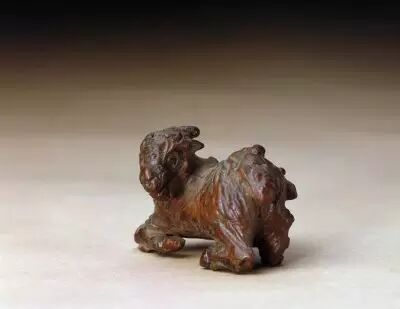 该木羊是利用树结的天然形状稍加处理而成。羊的头、角、耳朵、四肢等依势造型,天然别致。小羊四肢跪地,回首张目,口微启,似刚出生坠地正努力 挣扎站起,其神态十分令人怜爱。此类取自天然而自成天趣之物在皇宫内并不多见,比之富丽堂皇的工艺品平添了几许清新质朴之气。(张林杰)