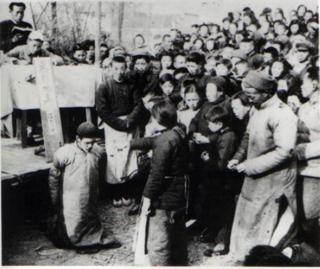 中共土改的拿手戏是斗争会,拉出 选定地主,唆使青年农民诉苦,共 干带头喊该杀,便立即处死,镇反 反则大杀县以下国府公教人员。