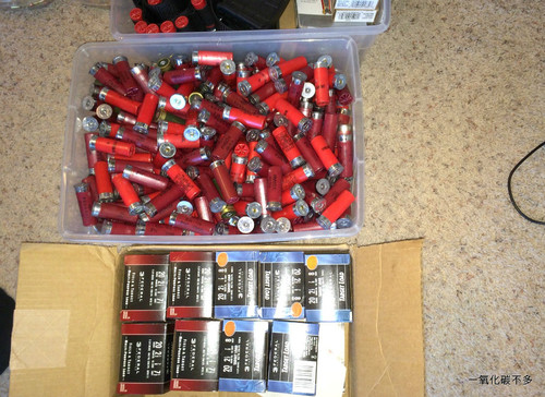 喷子用的霰弹存货也不少。前段时间禁枪,子弹断市,连霰弹也成稀罕屋,那个时候抢了千发左右存到现在。