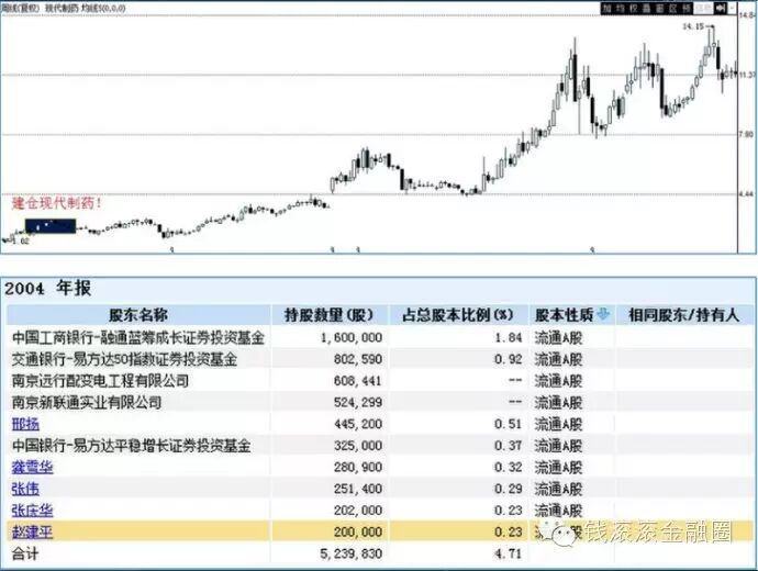 03-05年,赵建平以136万元资金出现在金岭矿业。通过投资金岭矿业,资金小幅增值。04年二三季度空仓。04年末重仓现代制药,之后赵建平榜上无名,经推断应该是基金公司大量买入,他被挤出前十大流通股东。这期间现代制药股价涨了4倍以上。没有详细数据看到他的卖出时间,只能根据他的投资风格推测他在现代制药上赚了数倍。