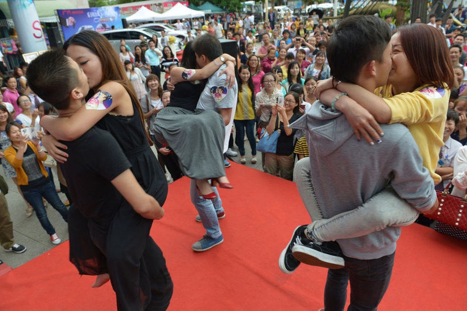 12月24日,武汉,美乐汇美食休闲广场举办“圣诞之吻情侣KISS大赛”,参赛 情侣必须经历自选动作、指定动作和爱的表白等环节,获胜者将赢得1.5万的物 资奖品,吸引不少情侣参赛。