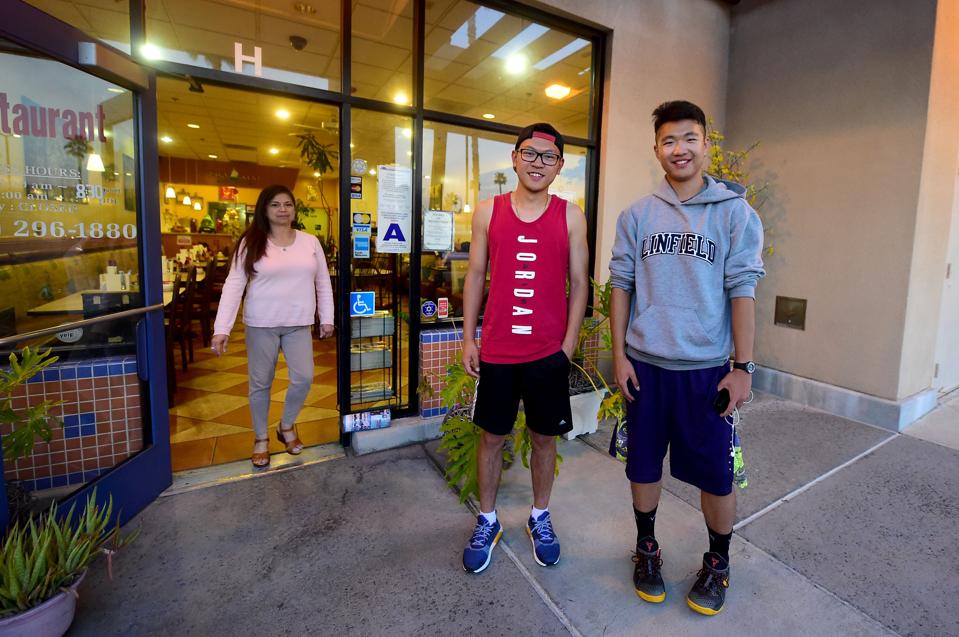 Chinese students Karl Li (L), from Jiangsu and Wisdom Xiewei (R) from Chongqing, are joined by their Host family mother Zennie Relova following a Vietnamese dinner in Temecula, California on March 23, 2016. Known as 'Parachute Kids', the two boys who live with their host family, are part of the increasing wave of Chinese students attending U.S schools and colleges, with American Education institutions eager for the tuition dollars. Credit: FREDERIC J. BROWN/AFP/Getty Images