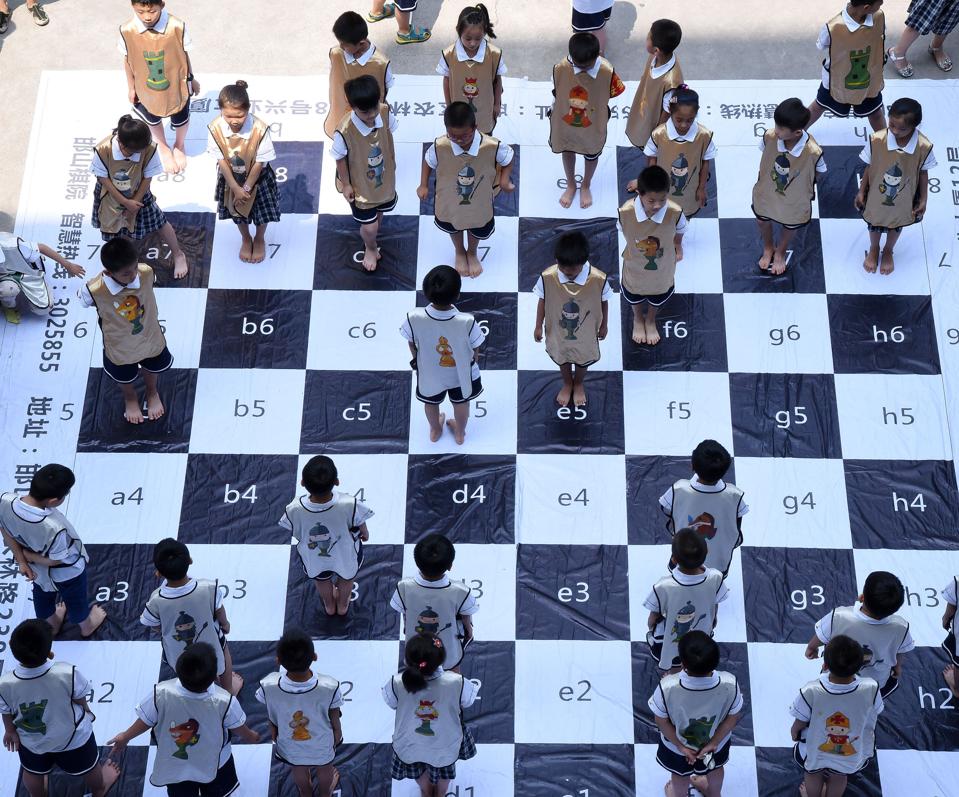 Children play chess on a giant chess board at a primary school in Handan in China's northern Hebei province on June 19, 2017. The 'live' chess game was played by 32 students to promote chess at the school. Credit: STR/AFP/Getty Images