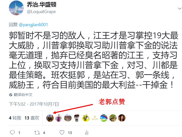 川普總統原戰略顧問班農的媒體報道,郭警告說, 北京欲“搞死”美國,他剛剛見過王岐山書記, 為啥要為郭背書? 迷底很快會揭開。-- 楊建利