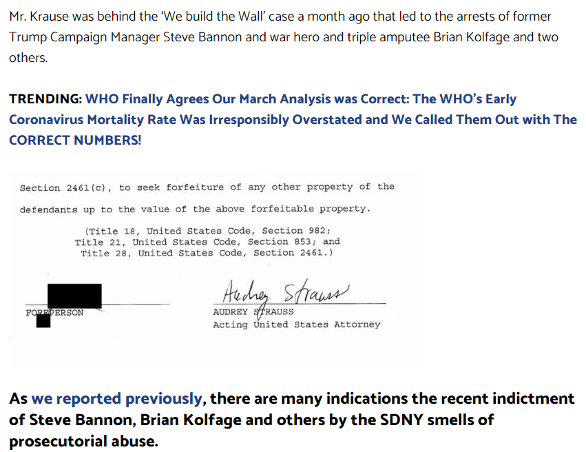 报道指出,克劳斯先生一个月前曾是“我们建墙”(We Build the Wall)案背后的推手,该案导致前川普竞选经理史蒂夫·班农(Steve Bannon),战争英雄和三度截肢者布莱恩·科尔法奇(Brian Kolfage)以及另外两人,因在有关修建美国南部边境隔离墙的项目上受到的虚假指控,而在2020年8月20日被捕。