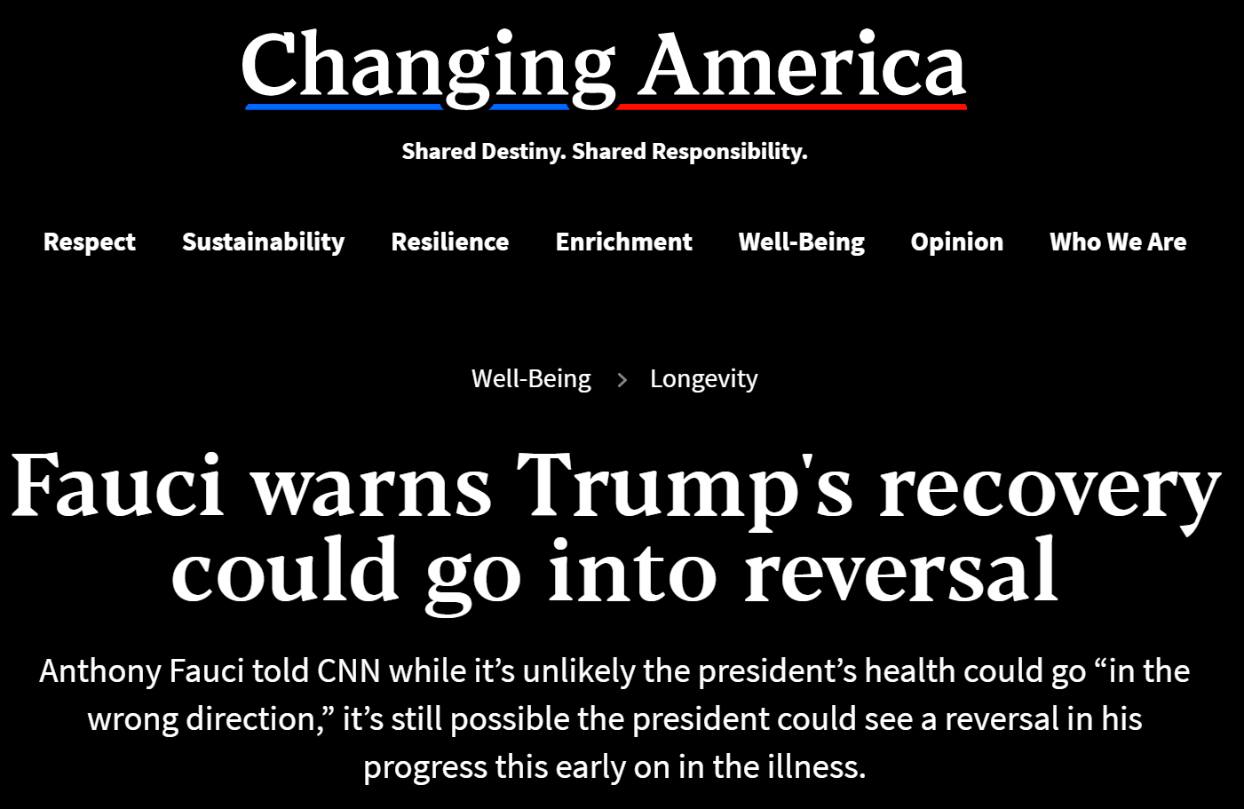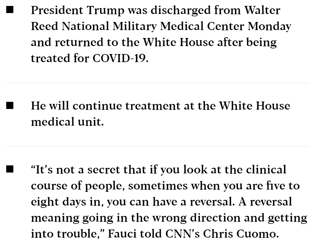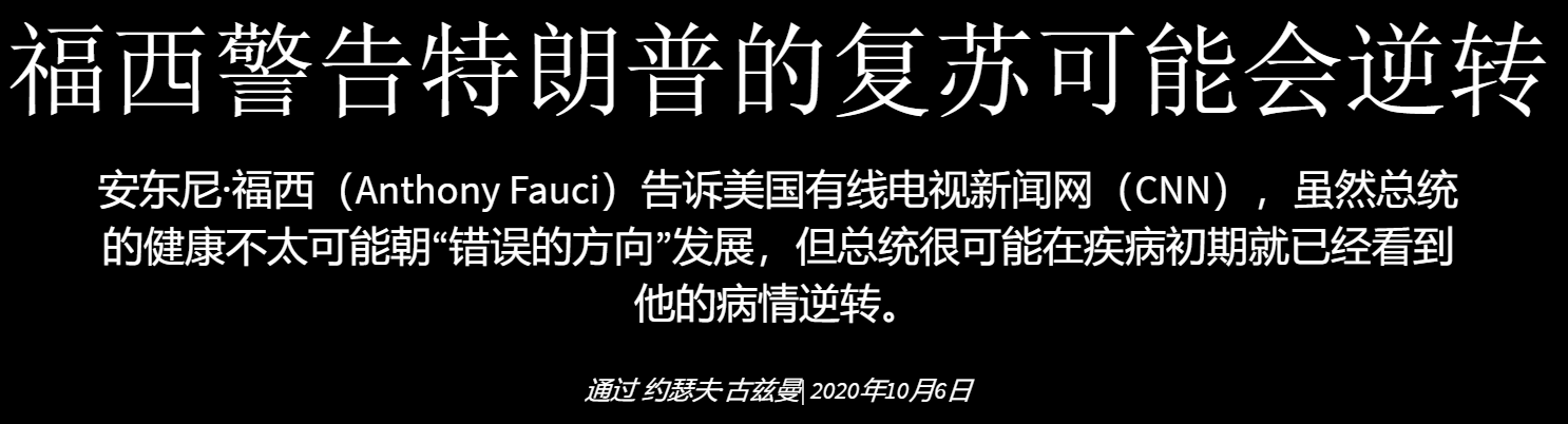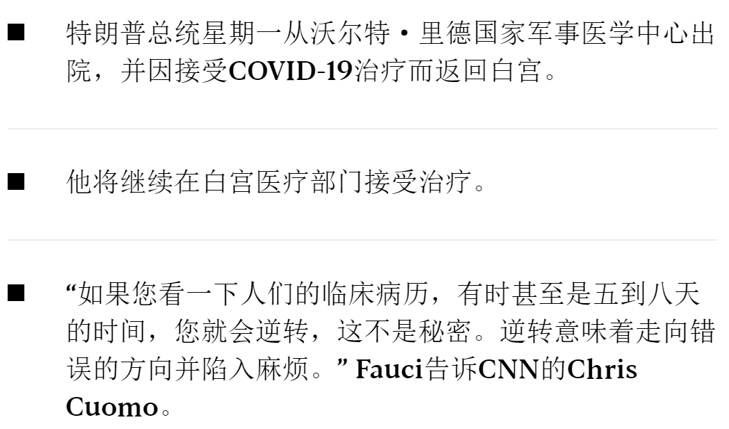 美国国家过敏和传染病研究所所长安东尼·富奇(Anthony Fauci)说,总统周一晚上离开沃尔特·里德国家军事医学中心后,医生需要警惕特朗普总统病情可能逆转。 白宫医师肖恩·康利周一下午对记者说,总统达到了出院的标准,将继续在白宫医疗部门接受治疗,但他指出,总统可能并不完全“出路”。仍处于他的冠状病毒感染的早期阶段。 我国正在与冠状病毒进行历史性斗争。将Changeing America添加到您的Facebook或Twitter提要中,以始终关注新闻。 在周一晚上接受美国有线电视新闻网(CNN)采访时,福西(Fauci)说,虽然总统不太可能看到他的病情恶化,但仍有可能。 Fauci告诉CNN的Chris Cuomo表示:“他看上去很好,因为您可以看到他出院时的样子。” “问题在于,他还处于疾病的早期阶段,因此,如果您观察人们的临床病历,有时甚至是五到八天的时间,您就可以逆转,这已不是秘密。这种颠倒的意思是走错了方向,陷入了麻烦。”美国顶级传染病专家指出。 他补充说:“这种情况不太可能发生,但是需要有所准备。” 总裁接受了实验性抗体治疗,并正在接受抗病毒药物瑞姆昔韦的疗程。他还接受了类固醇地塞米松的治疗,该药引起了总统的病情,因为该药通常只供重症患者使用。 星期五早些时候,总统宣布他和第一夫人对该病毒进行了阳性检测。那天晚些时候,他被带到沃尔特·里德(Walter Reed),并一直感到疲劳和发烧等症状。他还需要在星期五和星期六补充氧气。 仍在感染高度传染性病毒的特朗普周一星期一回到白宫后,走上南门廊的楼梯,移开面具,在南草坪上方的阳台上望去拍照。 总统在摄影师和其他工作人员附近,在转身回到白宫时没有戴上面具。 特朗普当天早些时候在推文中向其追随者说:“不要害怕Covid。不要让它支配您的生活。” Anthony Fauci, the director of the National Institute of Allergy and Infectious Diseases, says doctors need to be alert to a possible reversal of President Trump’s condition after the president left Walter Reed National Military Medical Center Monday evening. White House physician Sean Conley on Monday afternoon told reporters the president met the criteria to be discharged from the hospital and would continue treatment at the White House medical unit, but noted that the president may not be entirely “out of the woods” as he is still in the early stages of his coronavirus infection. Our country is in a historic fight against the Coronavirus. Add Changing America to your Facebook or Twitter feed to stay on top of the news. During an interview with CNN Monday evening, Fauci said while it’s unlikely the president could see a worsening of his condition, it’s still possible. “He looks fine as you can see the way he looked when he came out of the hospital,” Fauci told CNN’s Chris Cuomo. “The issue is that he’s still early enough in the disease that it’s not a secret that if you look at the clinical course of people, sometimes when you are five to eight days in, you can have a reversal. A reversal meaning going in the wrong direction and getting into trouble,” the nation’s top infectious diseases expert noted. “It’s unlikely that it will happen, but there needs to be heads up for it,” he added. The president has been treated with an experimental antibody treatment and is undergoing a course of the antiviral drug remdesivir. He was also treated with the steroid dexamethasone, which raised concern about the president’s condition as the drug is typically reserved for severely ill patients. Early Friday, the president announced he and the first lady had tested positive for the virus. He was taken to Walter Reed later that day and had been experiencing symptoms including fatigue and fever. He also required supplemental oxygen on Friday and Saturday. Trump, who is still infected with the highly contagious virus, walked up the stairs of the South Portico upon returning to the White House Monday evening, removed his mask and posed for photos while looking over the balcony above the South Lawn. The president was near a photographer and other staffers and did not put his mask back on as he turned to walk back into the White House. Trump earlier in the day tweeted to his followers, “Don’t be afraid of Covid. Don’t let it dominate your life.”