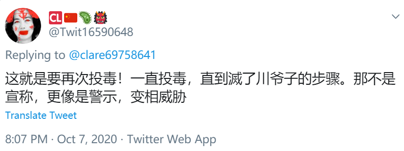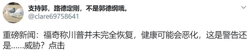 2020年当地时间10月8日上午8点15分,美国总统川普在其推特发布了一个帖文,内容如下: 「英文原文」:Obama, Biden, Crooked Hillary and many others got caught in a Treasonous Act of Spying and Government Overthrow, a Criminal Act. How is Biden now allowed to run for President? 「中文翻译」:奥巴马、拜登、扭曲的希拉里和其他许多人都被卷入了间谍和推翻政府的叛国行为案件当中,这是一种犯罪行为。现在怎么允许拜登竞选总统? 对于此次美国总统大选的结果,郭文贵先生很早就讲过:“此次美国大选将以大家想不到的滑稽的方式结束。”从川普总统的推文中可以推测出,未来等待拜登一定是其家族与中共CCP勾兑行为的败漏与揭发,可能将被美国选举委员会认定为“不具备总统候选人资格”而滑稽的结束。小编期待这一天早点的到来。 小编在此献上川普总统的该条推文截图: