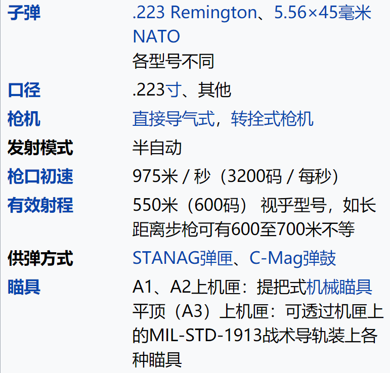 中文和英文维基百科的介绍,居然不一样! 噢,杰克博是在问你的AR-15是老版还是新版的? 前者 Muzzle Velocity 是 3200 ft, 后者新版的是 3300 ft , 新型每秒初始速度快出 31 米! 区别大了去了! 我这也是瞎说,是不是新旧型号之分?Muzzle Velocity 也能调节? 都说是成人的 LEGO, 杰克博把玩的 AR-15 是否功能很多的?