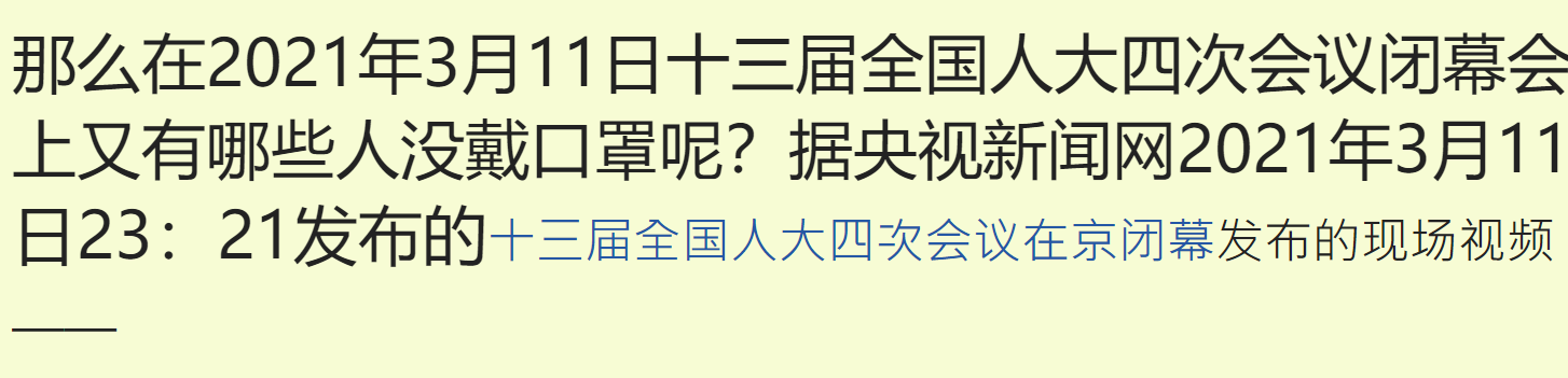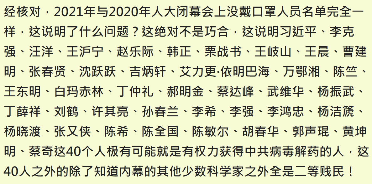 在前文通过去年人大闭幕口罩佩戴情况猜猜看谁有解药谁没有解药中我们通过视频比对找到了在2020年5月28日第十三届全国人民代表大会第三次会议闭幕会上没戴口罩的人共有40位,他们是:习近平、李克强、汪洋、王沪宁、赵乐际、韩正、栗战书、王岐山、王晨、曹建明、张春贤、沈跃跃、吉炳轩、艾力更·依明巴海、万鄂湘、陈竺、王东明、白玛赤林、丁仲礼、郝明金、蔡达峰、武维华、杨振武、丁薛祥、刘鹤、许其亮、孙春兰、李希、李强、李鸿忠、杨洁篪、杨晓渡、张又侠、陈希、陈全国、陈敏尔、胡春华、郭声琨、黄坤明、蔡奇。 那么在2021年3月11日十三届全国人大四次会议闭幕会上又有哪些人没戴口罩呢?据央视新闻网2021年3月11日23:21发布的十三届全国人大四次会议在京闭幕发布的现场视频—— 1’11”出场的大会主席团常务主席、执行主席王晨、曹建明、张春贤、沈跃跃、吉炳轩、艾力更·依明巴海、万鄂湘、陈竺、王东明、白玛赤林、丁仲礼、郝明金、蔡达峰、武维华、杨振武共15人未戴口罩;以及主席台成员习近平、李克强、汪洋、王沪宁、赵乐际、韩正、栗战书、王岐山共8人未戴口罩 6’59”出场的丁薛祥、刘鹤、许其亮、孙春兰、李希、李强、李鸿忠、杨洁篪、杨晓渡、张又侠、陈希、陈全国、陈敏尔、胡春华、郭声琨、黄坤明、蔡奇共17人未戴口罩,这一次又是40人未戴口罩。 经核对,2021年与2020年人大闭幕会上没戴口罩人员名单完全一样,这说明了什么问题?这绝对不是巧合,这说明习近平、李克强、汪洋、王沪宁、赵乐际、韩正、栗战书、王岐山、王晨、曹建明、张春贤、沈跃跃、吉炳轩、艾力更·依明巴海、万鄂湘、陈竺、王东明、白玛赤林、丁仲礼、郝明金、蔡达峰、武维华、杨振武、丁薛祥、刘鹤、许其亮、孙春兰、李希、李强、李鸿忠、杨洁篪、杨晓渡、张又侠、陈希、陈全国、陈敏尔、胡春华、郭声琨、黄坤明、蔡奇这40个人极有可能就是有权力获得中共病毒解药的人,这40人之外的除了知道内幕的其他少数科学家之外全是二等贱民! 在不经意间发现的这个四十人名单意味着啥呢?它意味着在郭文贵先生爆出了中共病毒有解药的惊天秘密之后,这40个人等于是公开暴露出来的有解药的,在接下来的全世界都盯着共产党要解药的过程中,在郭先生关于共产党有解药的爆料在墙内被越来越多人知道以后,这40个人是最有可能被身边那些没有解药的贴身人员干掉的目标!