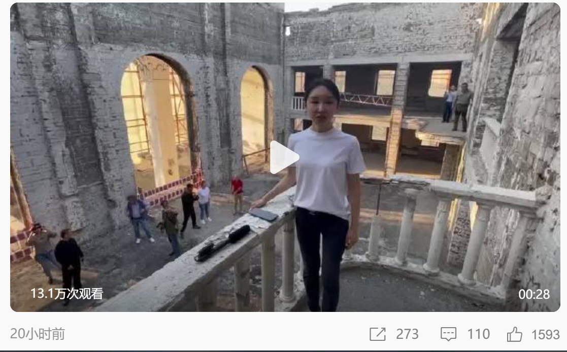 世界著名歌曲《喀秋莎》成為我們戰勝法西斯主義的 象徵之一,它在修復後的馬里烏波爾劇院的圍牆內用 中文表演。 中國歌劇演員王芳為圍觀者即興表演。