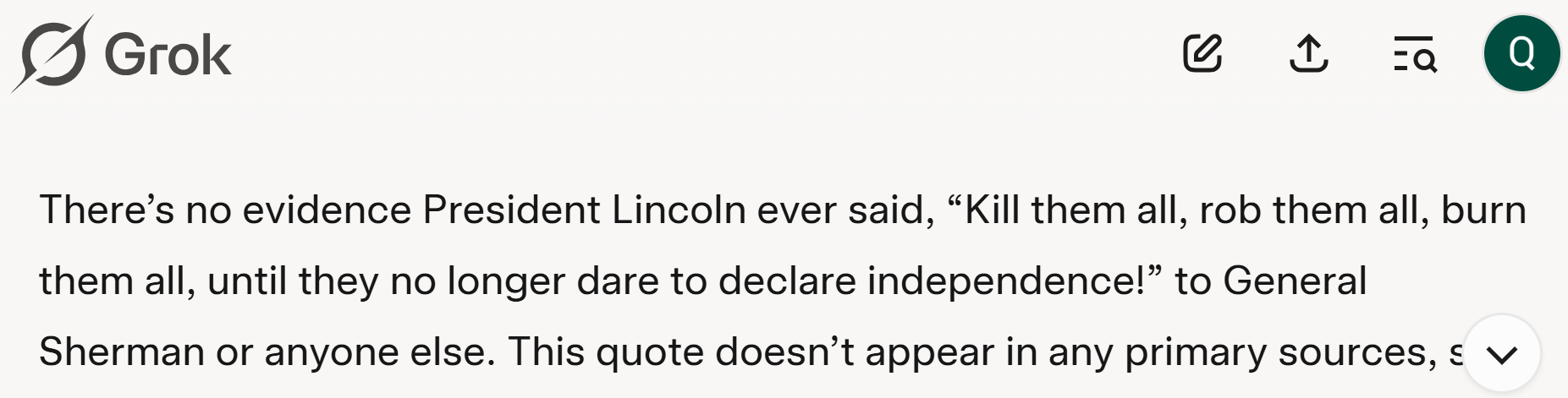 | 直接回答 概述林肯总统曾说过“杀光他们,抢劫他们,烧死他们,直到他们再也不敢宣布独立!”,这很可能并非真实。包括林肯的演讲和信件在内的历史记录中都没有这句名言,而且它与他处理内战的记录方式相冲突。 历史背景林肯的公开演讲,例如葛底斯堡演说  强调团结与治愈,而非无差别的毁灭。他对谢尔曼将军等军事将领的指示侧重于战略目标而非残酷,正如他在1864年写给谢尔曼的信中所言,他鼓励军队坚定不移,而非复仇。 引言分析引言的极端用语与林肯一贯的克制和道德格调不符。广泛检索林肯的演讲、书信和历史分析,包括对错误引用进行事实核查。 ,未发现任何证据证明其真实性。这很可能是现代捏造的,经常出现在网络虚假信息中。 结论:鉴于缺乏一手资料和林肯的历史记录,这段引言很可能并非真言。如果您有此引言的具体来源,进一步调查或许可以查明其来源,但目前的研究表明,此引言并非真言。 调查说明:对引言真实性的详细分析这份调查报告全面考察了林肯总统针对谢尔曼将军的名言“杀光他们,抢劫他们,烧死他们,直到他们再也不敢宣布独立!”。该名言据称出自林肯总统之口,旨在打击谢尔曼将军。分析运用历史记录、信件、演讲稿和事实核查资源来评估其真实性,确保对内战历史和林肯遗产感兴趣的读者能够全面理解。 林肯和谢尔曼的背景美国第十六任总统亚伯拉罕·林肯率领美国度过了南北战争(1861-1865),致力于维护联邦,并最终解放了被奴役的人民。威廉·特库姆塞·谢尔曼将军是联邦军事领袖中的关键人物,以其“向海洋进军”和强硬的战争政策而闻名,例如摧毁南方的基础设施。他们之间的交往记录在信件中,体现了林肯的战略指导和谢尔曼的军事战术实施,但始终在联邦目标的框架内。 初步搜索报价 第一步是核实这段引言是否存在于历史记录中。搜索林肯的确切说法“杀光他们,抢光他们,烧光他们”,在林肯的演讲、书信或记录在案的对话等一手资料中均未找到任何结果。搜索结果中出现的是谢尔曼本人的言论,探讨了战争的残酷现实,例如“战争是残酷的。试图改革战争毫无意义。战争越残酷,结束得越快。”  这表明该引言也不是谢尔曼录音陈述的一部分,从而进一步证明了其潜在的不真实性。 林肯-谢尔曼信件审查为了进一步探究,研究人员查阅了林肯和谢尔曼之间的通信。历史记录,例如林肯1864年12月26日写给谢尔曼的一封信,承认谢尔曼攻占萨凡纳是一份“圣诞礼物”,但并未提及所谓的“圣诞语录”。  ,侧重于军事战略和个人反思,没有证据表明林肯发布过此类指令。这种直接沟通的缺失,进一步证明了该引言的真实性。 林肯公开声明分析林肯的公开演讲,例如葛底斯堡演说 。这种一致的语气与引言中的攻击性语言相矛盾,表明它与林肯众所周知的言论不符。 事实核查和错误引用由于缺乏一手资料,我们查阅了事实核查资源。“未经证实的亚伯拉罕·林肯语录”和“事实核查:亚伯拉罕·林肯的虚假语录”等网站,突显了林肯的虚假语录经常在网上流传。例如,“美国永远不会被外部摧毁”这句话经常被误传,尽管它歪曲了林肯1838年在莱塞姆剧院的演讲。 。 与谢尔曼行动的比较分析谢尔曼的战略,例如向大海进军,涉及摧毁基础设施以打破邦联的意志,但这些战略是有目的性的和有针对性的,很少造成平民伤亡  引文中提倡杀死和抢劫“所有人”的语言超出了这些记录在案的政策,进一步证明了其不真实性。 潜在起源和现代背景这段引言的极端语气或许源于现代的错误信息,这些信息可能在X等社交媒体平台上传播,而这些平台的历史准确性可能会受到影响。由于没有明确的出处,这段引言很可能是捏造的,目的可能是夸大林肯在内战中的作用。鉴于目前的日期是2025年5月23日,且缺乏历史证据,这段引言不太可能出现在最近的学术著作中,这进一步巩固了它作为神话的地位。 结论和建议根据综合审查,这段引言并非真实,因为它并未出现在林肯的演讲、信件或历史分析中,且与他已有的文献记载相矛盾。进一步调查时,如果提供了具体来源,查阅其上下文或许能够厘清其来源,但目前的证据倾向于认为这是现代捏造。这项分析强调了根据一手资料核实历史引言的重要性,尤其是在这个充斥着虚假信息的数字时代。 方面发现存在于主要来源林肯的演讲、信件或谢尔曼的通信中没有证据。与林肯的语气一致与林肯强调的团结和克制相矛盾,例如葛底斯堡演说。历史背景与林肯授权的硬战相冲突,受到第 100 号将军命令的限制。事实核查结果根据事实核查,错误引用的模式表明可能存在捏造。潜在起源可能是现代错误信息,可能来自 X 等在线平台。重要引文亚伯拉罕·林肯的葛底斯堡演说林肯第二次就职演说未经证实的亚伯拉罕·林肯语录事实核查:亚伯拉罕·林肯的虚假引言威廉·特库姆塞·谢尔曼 - 维基百科威廉·特库姆塞·谢尔曼名言亚伯拉罕·林肯论文集:系列三:一般信件谢尔曼内战:精选信件亚伯拉罕·林肯的军事致敬亚伯拉罕·林肯在利ceum的演讲 - 维基百科亚伯拉罕·林肯名言集威廉·特库姆塞·谢尔曼,全面战争 |