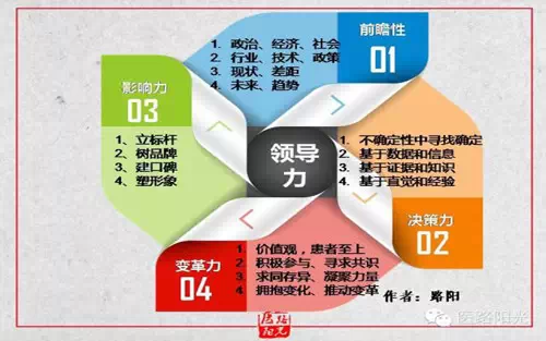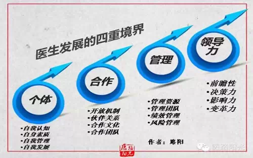 未来的医疗体系和社会环境下,各利益方之间的关系呈现超级链接特点,数据共享下的信息越来越透明、患者对于医疗安全的要求越来越高、政府对于医疗机构的监管越来越严格、医保对于医疗机构施加的成本压力越来越大、医疗机构内部越来越扁平化、医生会被赋予更多的职责与权力,同时也意味着更多的责任和更高的能力。因此,一个医生仅仅能够“独善其身”是远远不够的。 未来医生的四重境界 第一重境界:个体 ●未来的医生更加开放、坦诚、平等、多元化、同时尊重个人信仰和文化。 ●未来的医生更应清晰个人的定位,了解自身的优势、劣势和特点。 ●未来的医生更应意识到心理压力对自身及他人的影响,意识到因情绪而产生的偏见、以及偏见对于判断和行为的影响。 ●未来的医生不仅能担责任、守承诺、保持医疗质量稳定性,也能够在与他人合作中保持灵活性和兼容性,同时保证工作、生活、健康的平衡。 ●未来的医生不仅通过继续教育渠道学习,更能从实践中学习、从同行学习,同时更需要跨学科、跨专业、甚至跨界学习。 第二重境界:合作 ●未来的医生将不再鼓励个人英雄主义,而越来越强调团队作用。 ●未来的医生更愿意倾听来自各专业的意见和建议、能够站在患者的角度上换位思考,争取获得同行和患者的信任和尊重。 ●未来的医生更需要保持开放的心态、“以患者为中心”建立一个共同面对疾病的由多学科医务人员、患者及家属组成的任务小组。 ●未来的医生不仅有能力聚集多专业资源,更需要搭建一个共享信息和资源,通过多种形式互动、沟通、反馈的合作平台。 ●未来的医生不仅能够搭建平台,更有能力制订规则、明确职责与分工、鼓励参与和贡献、接纳吸收不同意见、做出最佳决策。 第三重境界:管理 ●未来的医生将面临机构扁平化,将获得越来越多的授权,也承担更多的责任。 ●未来的医生需要具有资源获取和整合能力,同时能够管理资源、减少浪费、降低成本、提高效率。 ●未来的医生需要人力资源管理方面的技能,在不同范围内为团队提供方向、指南、资源和支持。 ●未来的医生需要具有管理绩效的能力,能够基于数据进行分析评估,基于问题开展反思和改进,基于经验教训进行学习与提升。 ●未来的医生需要具有风险管理能力,能够识别评估监测患者安全风险,能够系统化分析评价改进方法和方案,能够积极推行患者安全文化,倡导流程再造。 第四重境界:领导力 ●未来的医生视野更广、眼界更远,能够深刻理解政治、社会、技术、经济环境,也能判断医疗行业现状和未来发展趋势和机会。 ●未来的医生不仅具有前瞻性,更需要决策力,能够在不确定中寻找确定,能够基于数据和信息、基于证据和知识、基于经验和直觉做出正确决策。 ●未来的医生更加注重打造影响力,立标杆、树品牌、建口碑、塑形象。 ●未来的医生更需要具有变革力,以患者为中心、跨学科、跨界整合资源、凝聚团队和人心、拥抱变化、推动变革。