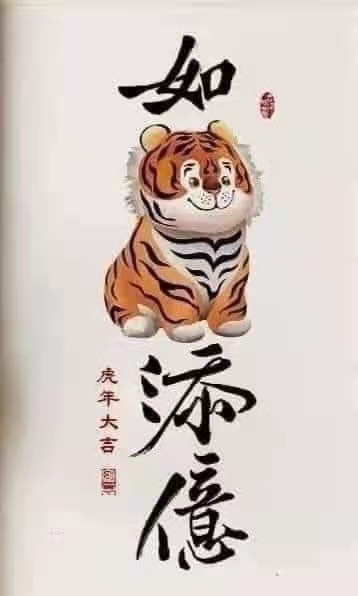 为迎接虎年,闺女特意给四哥四嫂画了一幅肖像画。四嫂昨天锦上添花,又特意为闺女的景阳冈双虎情深图,亲笔题了祥虎迎春四个大字: