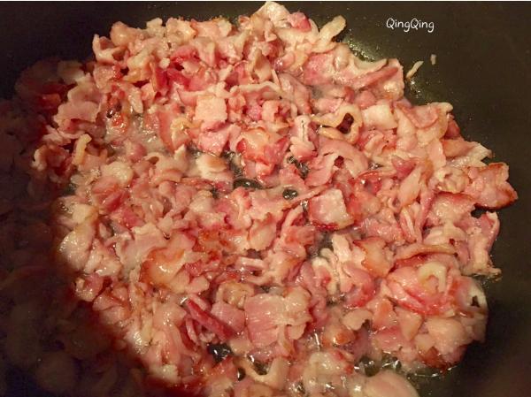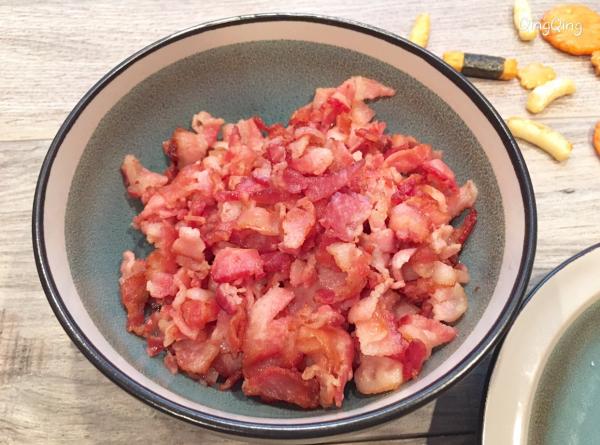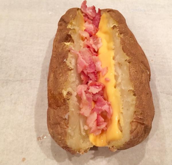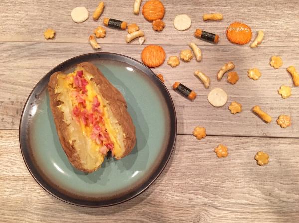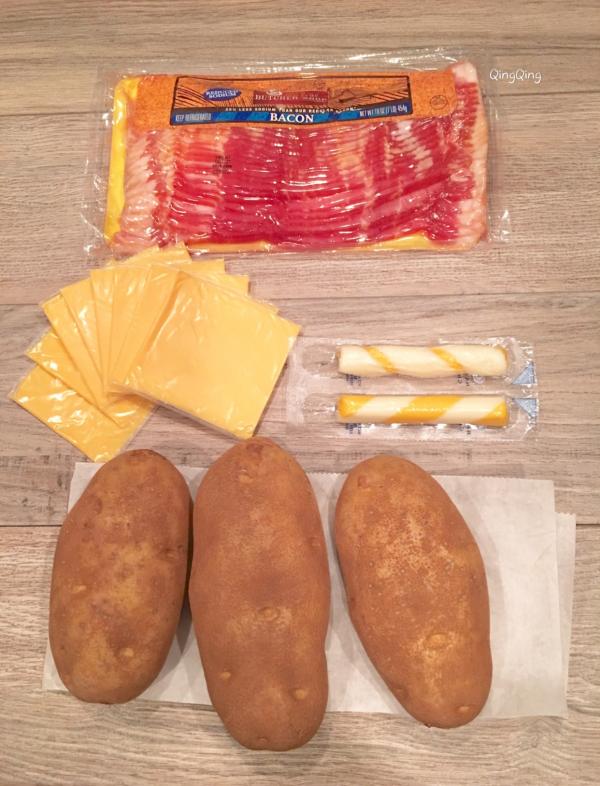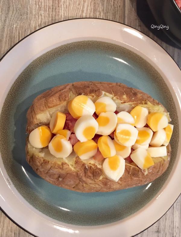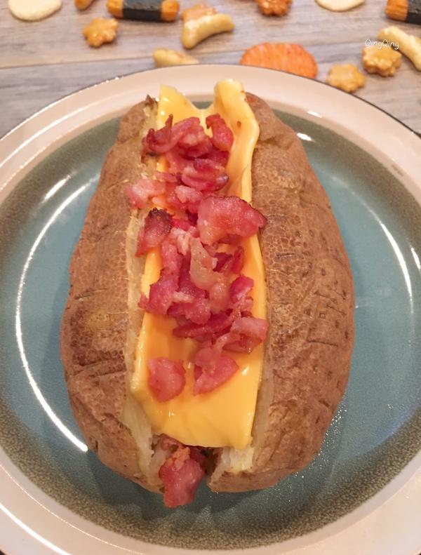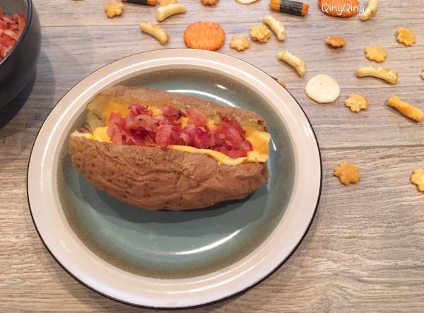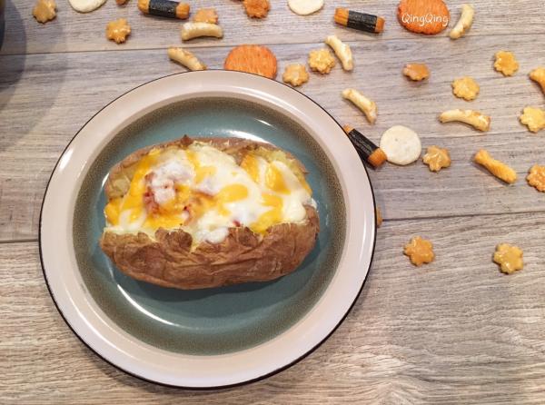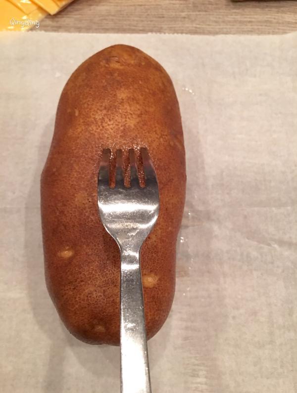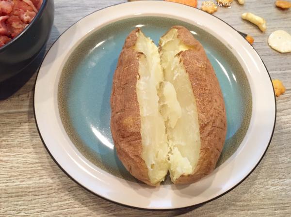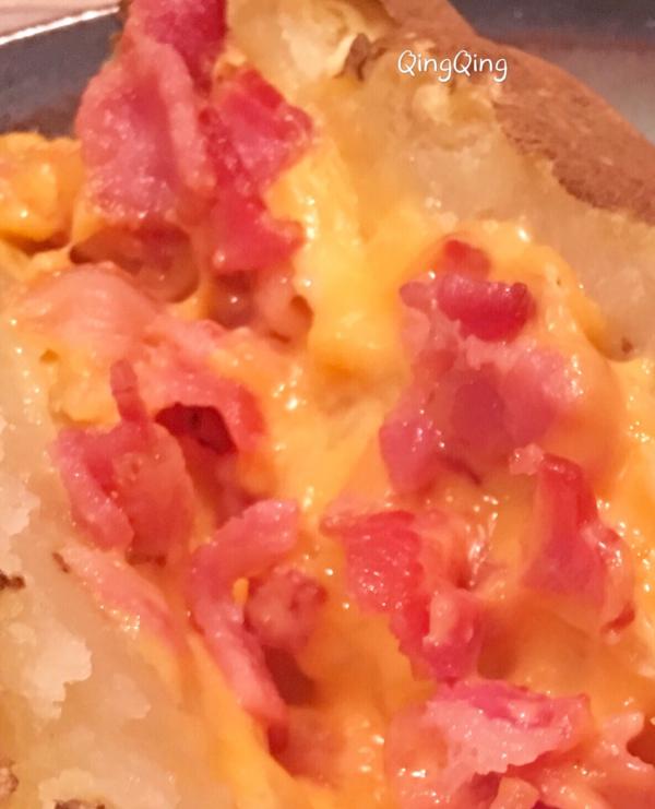 一、材料 大马铃薯、芝士、培根 二、做法 1、洗净马铃薯,用西餐的叉子在其表面均匀戳出小孔,放入微波炉打五分钟,换面再打三-四分钟; 2、培根剁碎后热锅煎熟,用餐巾吸走多余的油脂备用; 3、对半不到底切开马铃薯,放入熟培根,铺上芝士,再放回炉一分钟。