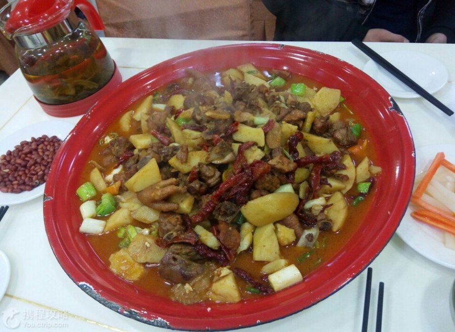 6、新疆大盘鸡!真的是超超超大盘!看这个桌子都放不下了。。。没骗你!吃完记得再叫烤串哦。