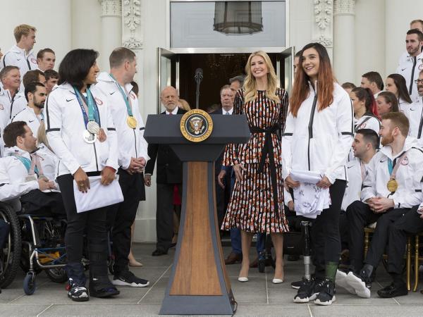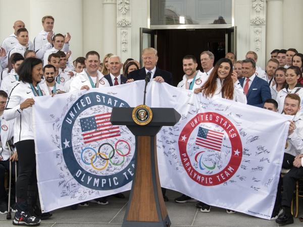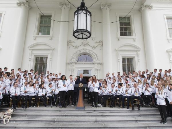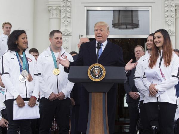 2018年4月27日,美國華盛頓,美國總統川普在華盛頓特區的白宮為來自美國隊的奧運選手舉辦慶祝活動。川普為美國隊舉行慶祝活動,發表講話。川普並與運動員互動。