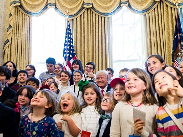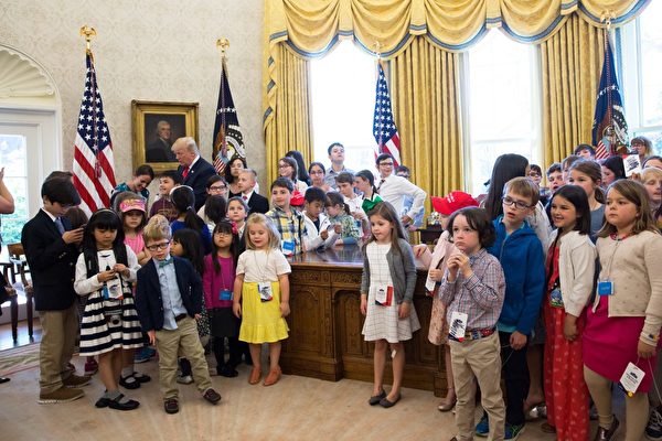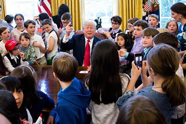 在橢圓型辦公室,孩子們圍在川普身旁,問著各種各樣的問題,川普則耐心地回答,現場歡聲笑語,非常快樂。