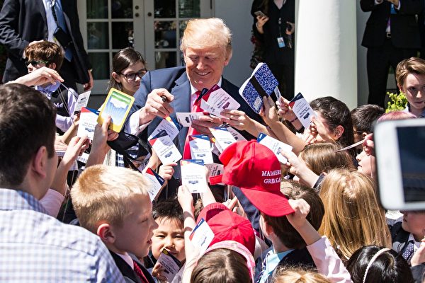 在白宮玫瑰花園,川普發表了熱情洋溢的演講,並給孩子們簽名留念。