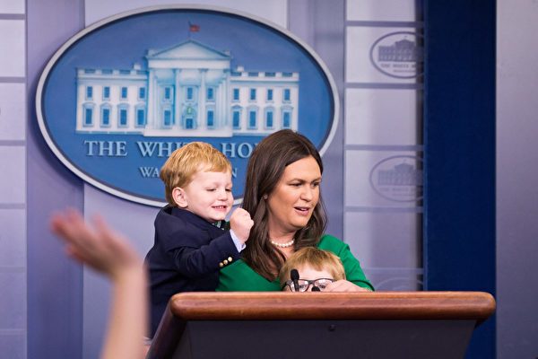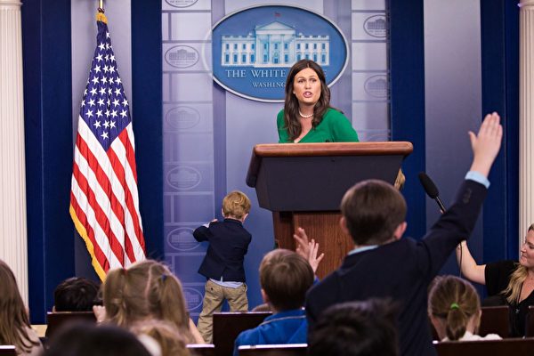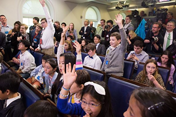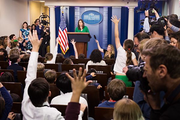 在稍早的記者會環節,孩子們跟白宮新聞秘書桑德斯模擬了一場記者會。記者會由桑德斯先通報情況,之後讓孩子們提問。