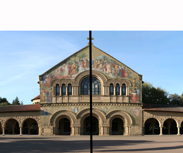 从中间一分为二。左边一根柱,右边一根柱。左边一扇窗,右边一扇窗。左边一扇门,右边一扇门。