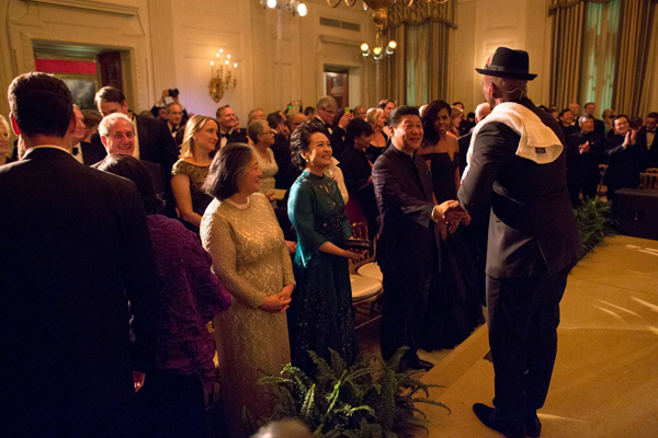 2015年9月25日,国宴结束后,美国歌手NE-YO在演唱完歌曲向习近平握手问候。现场不少来宾随着音乐舞动肢体,显得都很投入,但习大大全程双手紧握,相比之下,彭麻麻就显得从容得多。