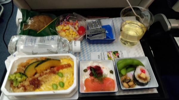 商务舱的座位可以180度放平,美美的睡一觉。 早餐: (东京时间是下午)
