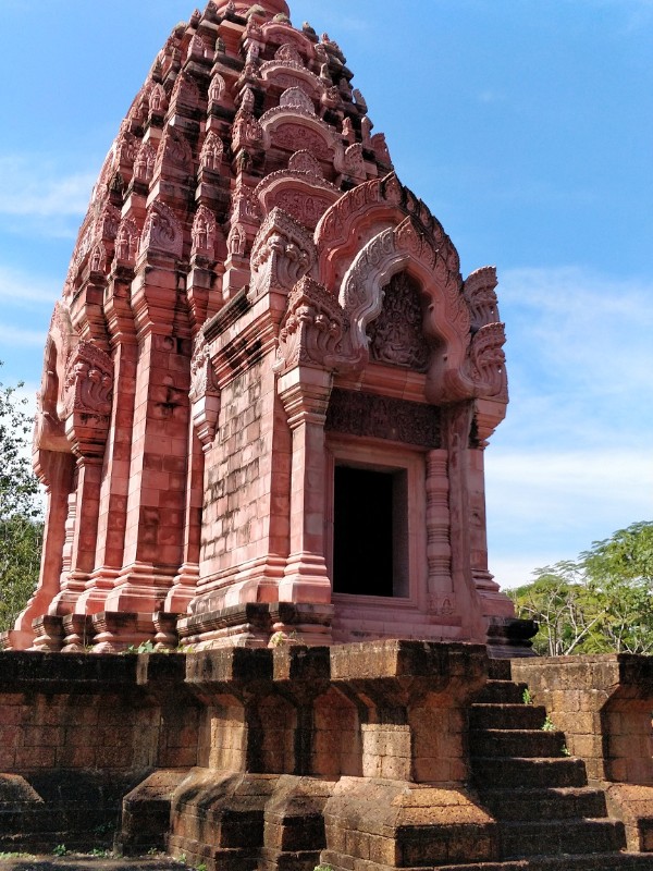 当时没来得及细看。事后问谷哥: Prasat phra Wihan (Preah Vihear) stands on the summit of Phra Wihan Hill, on the south face of the Phanom Dong Rak Range escarpment on the Thai-Cambodian border, Si Sa Ket Province. This stone sanctuary was built in the reign of King Suryavarman I around 1038 A.D. As for the architectural style, beginning from the depression at the foot of the hill slope and moving up to the hill, one passes through a series of 4 groups of stone structures established at different levels. All buildings have gable roofs, not the spired pyramid roofs of palace structures. It would be more correct to call the ruins “monthien”. 帕威汉城堡(谷哥网图):