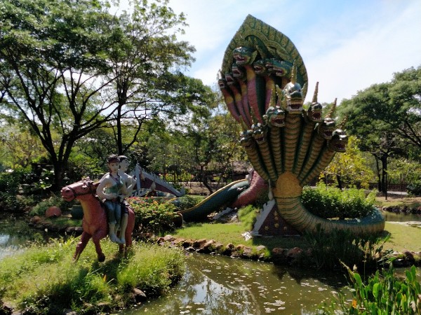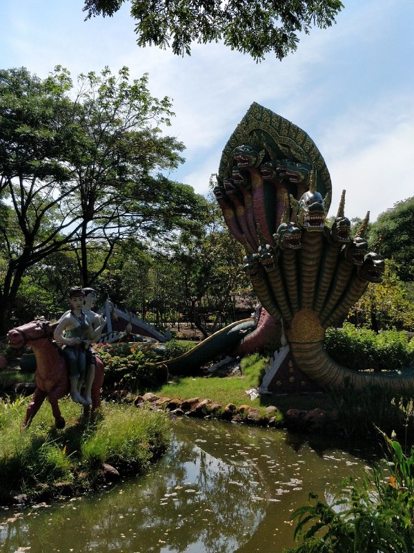 看上面的文字介绍原来是个传奇故事: “南爱,康康城(Khomkham)最美的姑娘,和帕蓬统治者帕登多次幽会。纳噶王子发现了南爱的无可匹敌的美丽,却无法获得芳心。最后,他把自己变成一只白松鼠,试图欺骗和绑架南爱。白松鼠失败而被杀。。。 之后暴雨淹没了整座城市。帕登试图逃脱,但南爱从马上摔下来,淹死在河中。白松鼠的灵魂成了纳嘎国王,把南爱带到他的水下王国。”