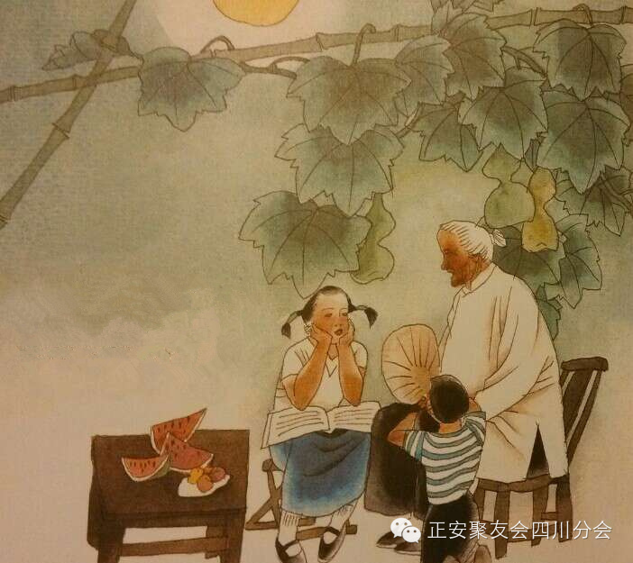 在我们居住的院子里,有一个葡萄架子,夏日炎炎,遮阴纳凉;有一口井,井水清澈,永远是冬暖夏凉;有一个石头桌子,几个石板凳。夏天里,大家都喜欢打上一桶井水,把西瓜放在桶里冰着,到了晚上,一家人围着石头桌子啃着西瓜,又凉爽又惬意。记得还有一个手推石磨,每年到了腊月二十几,天天都有邻居们排着队等着磨糯米粉做汤圆。炎热的夏天里,院子里面凉风习习,晚饭后,家家的大人孩子都拿着一把蒲扇在院子里乘凉,我们一群人围着叶伯伯,一边数着天上不断眨眼的星星,一边听着老人给我们讲神话故事,时不时有流星从天上划过……童年的记忆,永远是美好的。