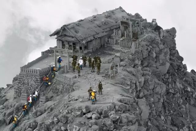 火山爆发后,被火山灰覆盖的寺庙,日本。