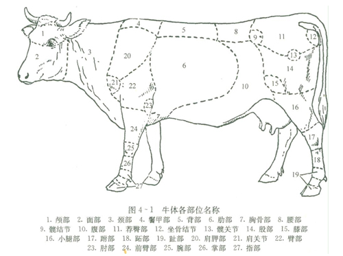牛分黄牛、水牛、牦牛、乳牛四种,其中以黄牛肉为最佳。黄牛肉的颜色一般呈棕红色或暗红色,脂肪为黄色,肌肉纤维较粗,肌肉间无脂肪夹杂。犍牛肉肌肉结实柔细、油润,呈红色,皮下有少量黄色脂肪,肌肉间也夹杂少量脂肪,质量最好。犊牛肉呈淡玫瑰色,肉细柔松弛,肌肉间含脂肪很少,肉的营养价值及鲜味远不如成年的牛肉。母牛肉呈鲜红色,肌内较公牛肉柔软。老的母牛皮下往往无脂肪,只肌肉间夹有少量脂肪。此外,南方的水牛肉,肉色比黄牛肉暗,肌肉纤维粗而松弛,有紫色光泽。脂肪呈黄色,干燥而少粘性,肉不易煮烂,肉质差,不如黄牛肉。按烹调的需要,牛肉 除头、尾、蹄及下肢以外,分为16个部位。