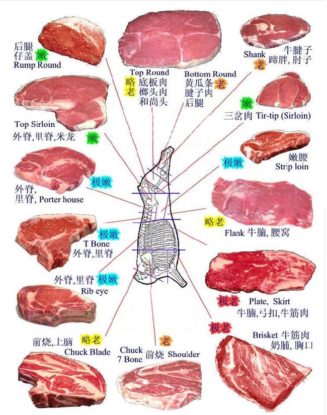 以下是牛肉各部位和质地简介。由上到下,由嫩到老排列。