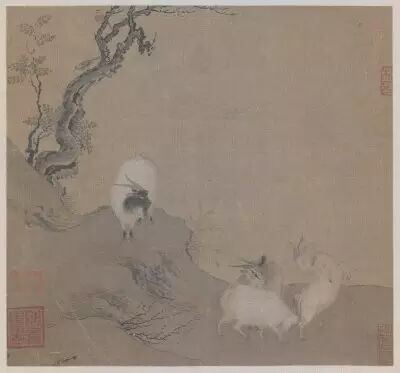 这是南宋画家陈居中创作的一幅极为生动的动物画:两只小山羊打闹嬉戏,一只羊似欲走来制止,又一只则立于土坡之上俯视下方。画家将动物之间的互