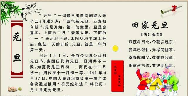 据传说起于三皇五帝之一的颛顼,距今已有3000多年的历史。“元旦”一词最早出现于《晋书》:“颛帝以孟夏正月为元,其实正朔元旦之春”的诗中。南北朝时,南朝文史学家萧子云的《介雅》诗中也有“四季新元旦,万寿初春朝”的记载。宋代吴自牧《梦粱录》卷一“正月”条目:“正月朔日,谓之元旦,俗呼为新年。一岁节序,此为之首。”;汉代崔瑗《三子钗铭》中叫“元正”;晋代庾阐的《扬都赋》中称作“元辰”;北齐时的一篇《元会大享歌皇夏辞》中呼为“元春”;唐德宗李适《元日退朝观军仗归营》诗中谓之“元朔” 我国在发掘大汶口文化遗物中,发现一幅太阳从山颠升起,中间云烟缭绕的图画。经考证,这是我国最古老的“旦”字写法。后来,在殷商的青铜器铸铭上,又出现了被简化的“旦”的象形字。“旦”字是以圆圆的太阳来表示的。“日”下面的“一”字表示地平线,意为太阳从地平线上冉冉升起。