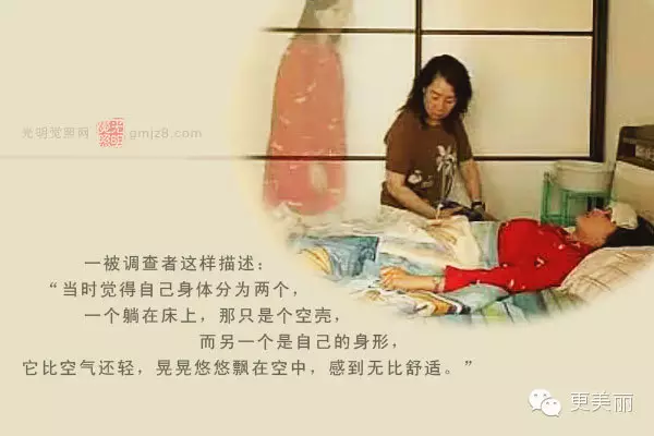 更有趣的是,近半数人有意识或灵魂从自身分离出去的感受,觉得自身形象脱离了自己躯体,有人将之比喻为“灵魂出壳”。他们强调自身功能的感觉是在身体之外的某处空间,而不是在大脑,并认为其生理的身躯是无活力和无思维的。甚至有的报告者还称,在自己生理身体之外的半空中或天花板上,“看到”自身的形象。这种躯体外的自身形象也具有某些生命指征,如脉搏、呼吸等,有时还可返回到自己生理的身体中去,或同其以某种方式相连接,与自己生理的身体相比重量轻,但身高和年龄相同。也有称当时自己生理的身体并非健全,如丧失听力或缺少某个肢体等,而非真实的身体却不存在这种缺陷。一被调查者这样描述:“当时觉得自己身体分为两个,一个躺在床上,那只是个空壳,而另一个是自己的身形,它比空气还轻,晃晃悠悠飘在空中,感到无比舒适。”