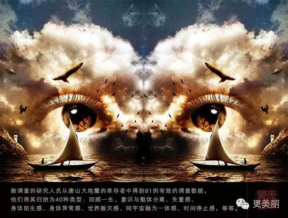 同一次地震中的幸存者王某陈述说:"朦胧之中进入了另外一个世界,只见眼前出现了一个穿长袍马褂的男人。他一瘸一拐地走到我面前,虽然离得很近,但相貌却怎么也看不清楚,面部模糊一片。他带我走进一个深不可测的黑洞,我眼前一片漆黑,只觉得身体在不由自主地跟着他走。行至黑洞的尽头,我才发现眼前是一个金壁辉煌的地下宫殿。"做调查的研究人员从唐山大地震的幸存者中得到81例有效的调查数据,他们将其归纳为40种类型:回顾一生、意识与躯体分离、失重感、身体陌生感、身体异常感、世界毁灭感、同宇宙融为一体感、时间停止感,等等。对于绝大多数人来讲,都能体验到两种或两种以上感觉的并存。