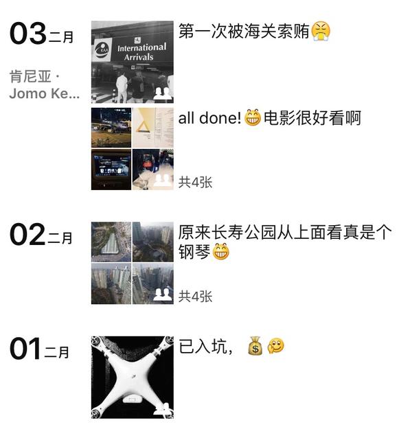 1. 朋友圈记录了购入无人机,第一次试飞,在肯尼亚内罗毕海关因无人机被索贿的全过程