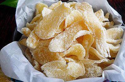 姜糖片 1、选用鲜姜洗净去皮后,切成三至五毫米的薄片; 2、按生姜50份、白糖32份、白糖粉4份、柠檬酸0.25份备料; 3、先配制与姜片等重的柠檬酸溶液,同姜片一起加热至沸,捞出姜片漂洗干净,滤除杂质后放入白糖再煮,煮至糖液浓厚,滴液成珠时即可停火,把生姜片捞出; 4、捞出姜片后,撒上白糖粉拌匀,摊晒一二天或置烘烤炉中,在摄氏40-50度下烘4小时左右,即可干燥成白姜糖片。