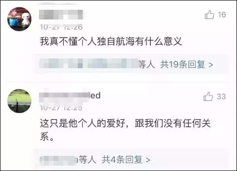 在我上岸后,我接受了很多媒体的采访。他们都会问我同一个问题,就是你为什么要做这样一个挑战。虽然大部分人对我做的事情表示钦佩,但是也会有人对我的冒险表示不理解,认为我太自我。