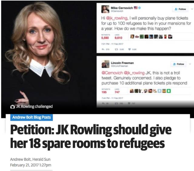 哈利波特的作者J.K.罗琳由于同情难民,批评川普的禁穆令,目前正在被川普支持者们揪住“吊打”。一个名叫马尔库斯的法国人在请愿网站change.org发起签名,要求罗琳开放她在英国有18间空房的豪宅给难民住。这个请愿一出,签名人数立即超过2万,现有华人川普支持者也在号召大家参与。