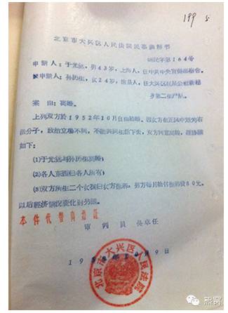 申请人:于光远,男43岁,上海人,住中共中央宣传部宿舍。 被申请人:孙历生,女24岁,沧州人,住大兴区红星公社新建乡第二生产队 案由:离婚。 上列双方于1952年10 月自由结婚。因女方在正(应为整)风中划为右派分子,政治立场不同,不能共同生活下去,双方同意离婚,经协议如下: (1)于光远与孙历生离婚, (2)个人东西归个人所有, (3)双方所生二个女孩归女方抚养,男方每月给付抚养费80元。以后经济情况变化时另议。 (红字图章:“本件代替离婚证”)