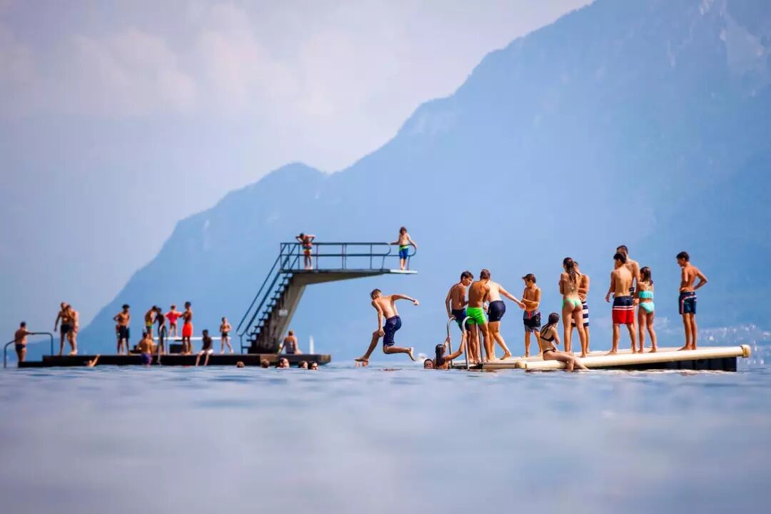 7月25日,人们在瑞士吕特里的日内瓦湖畔享受温暖的天气。