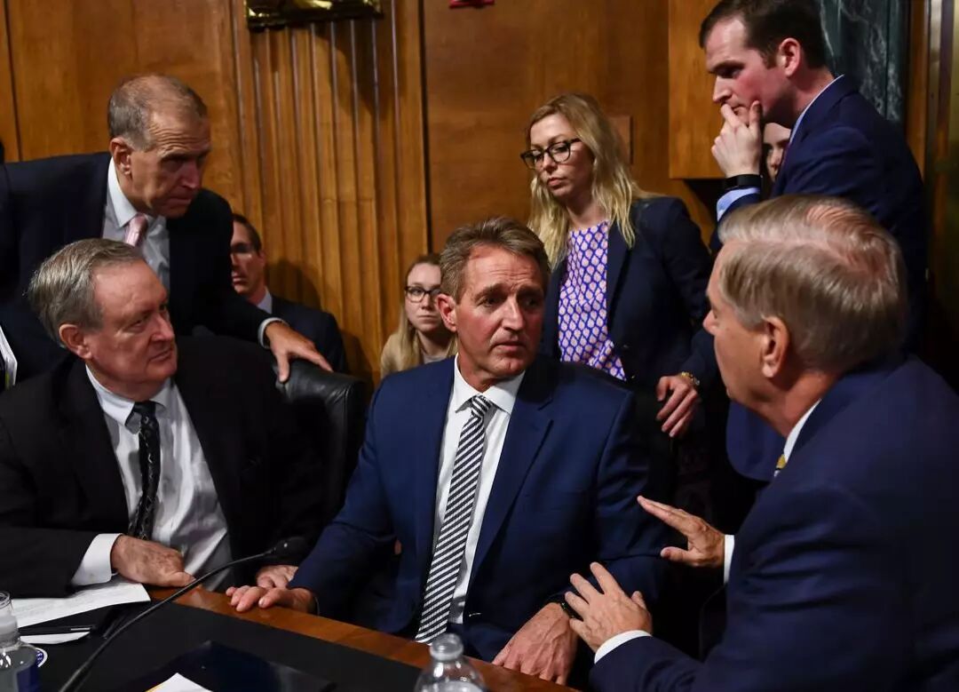 Flake)与同事交谈。在这场戏剧性的听证会中,法官驳回了原告的性侵指控,而后卡瓦诺的提名得以提交投票表决。