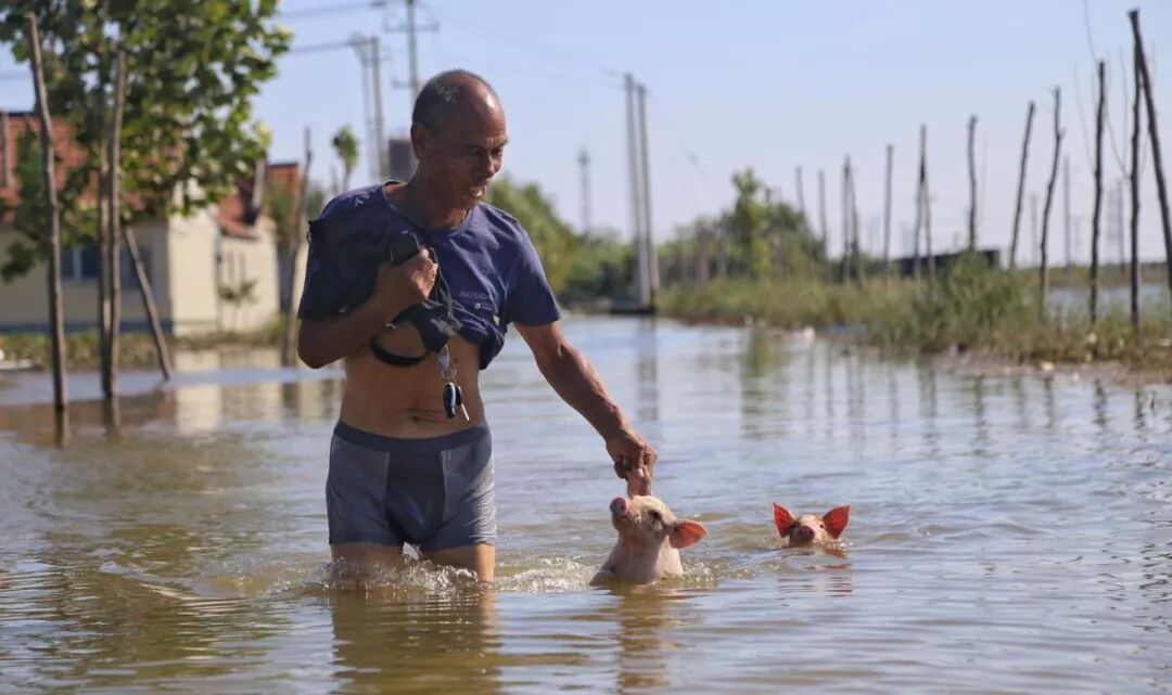 8月23日,台风温比亚(Rumbia)席卷中国东部寿光市的一座村庄,图为一名男子带着两头猪趟过被淹没的街道。
