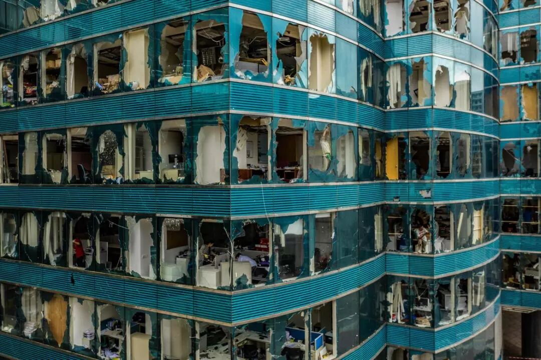 9月17日,台风山竹过境香港,图为一栋墙面玻璃大面积破碎的大楼。这场台风的持续风速高达每小时170英里(约274公里),相当于5级飓风。