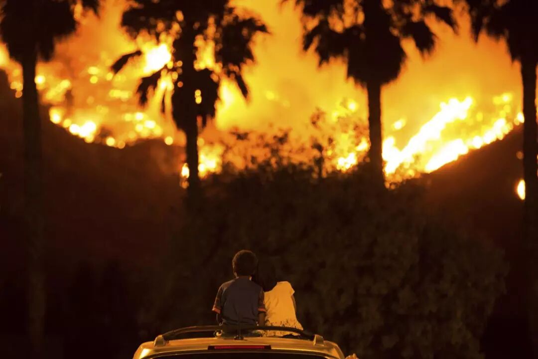 8月10日,6岁的巴斯(King Bass,左)和他5岁的妹妹普琳塞丝(Princess)坐在父母的车上看着加州埃尔西诺湖的森林大火。逾1,000名消防员在山上奋力灭火,以阻止大火蔓延至山脚下的居住区。