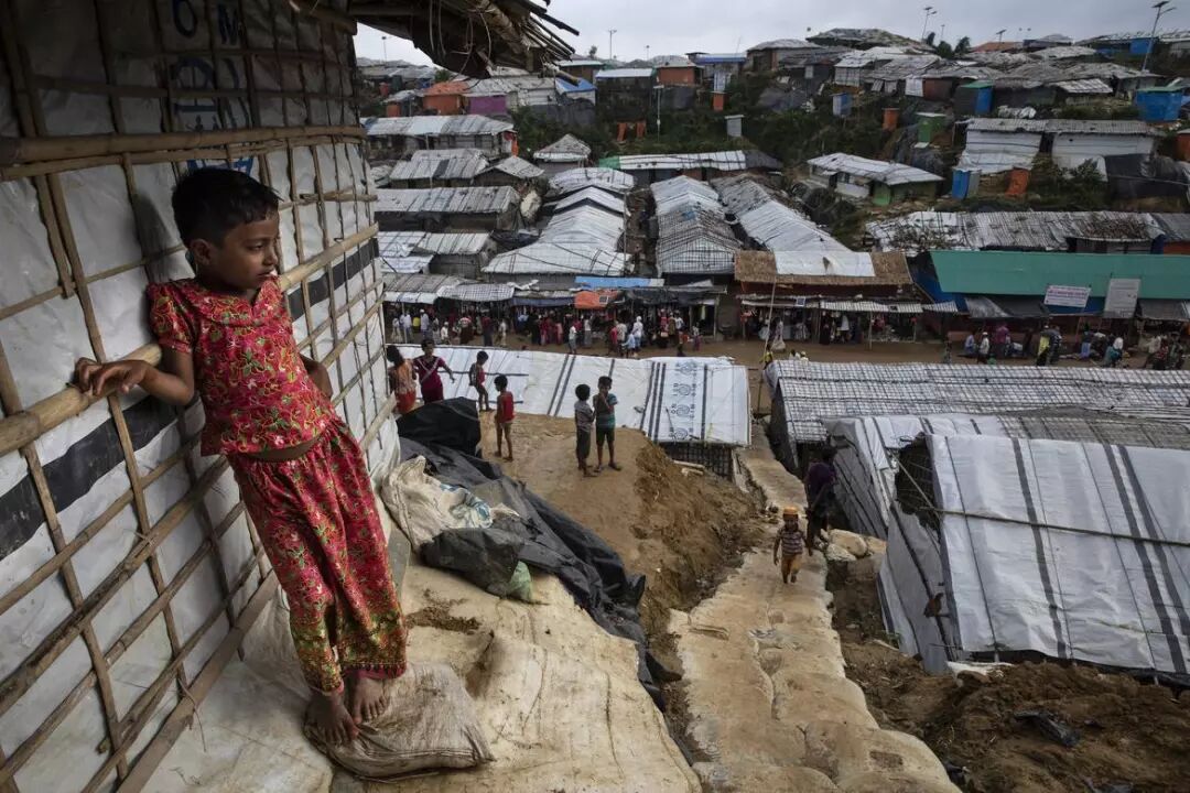 孟加拉国的一座难民营,六岁的罗兴亚女孩卡利达(Nur Khaleda)站在她和家人居住的棚屋外。