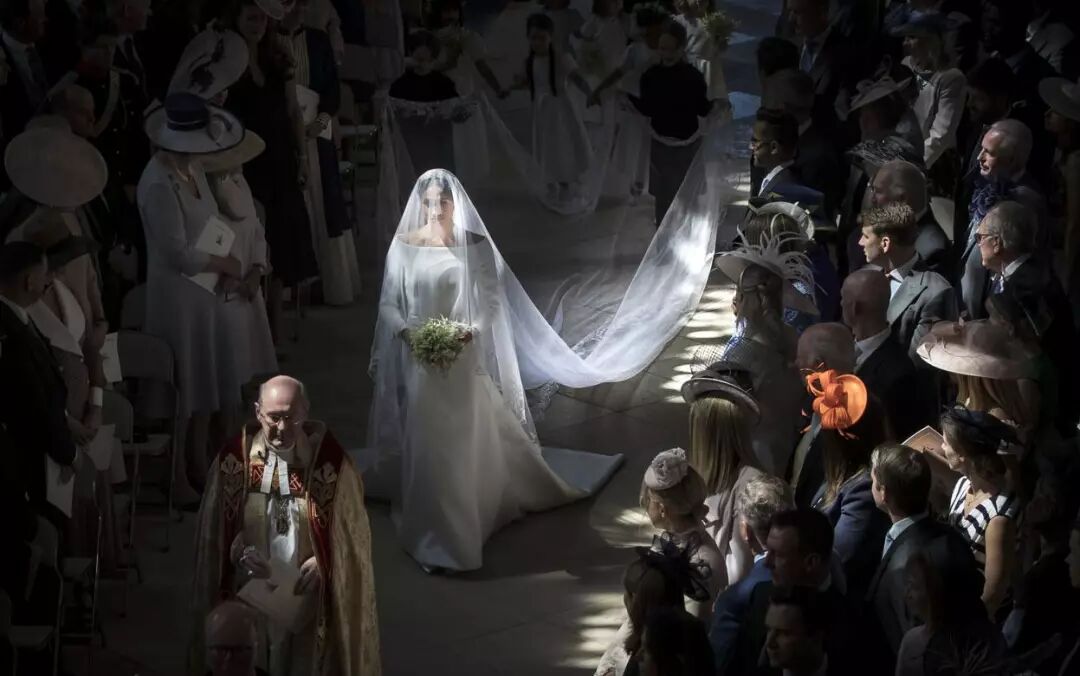 5月19日,英国苏塞克斯公爵哈里王子与女演员梅根·马克尔(Meghan Markle)的婚礼在温莎城堡圣乔治教堂举行。图为新娘步入教堂。